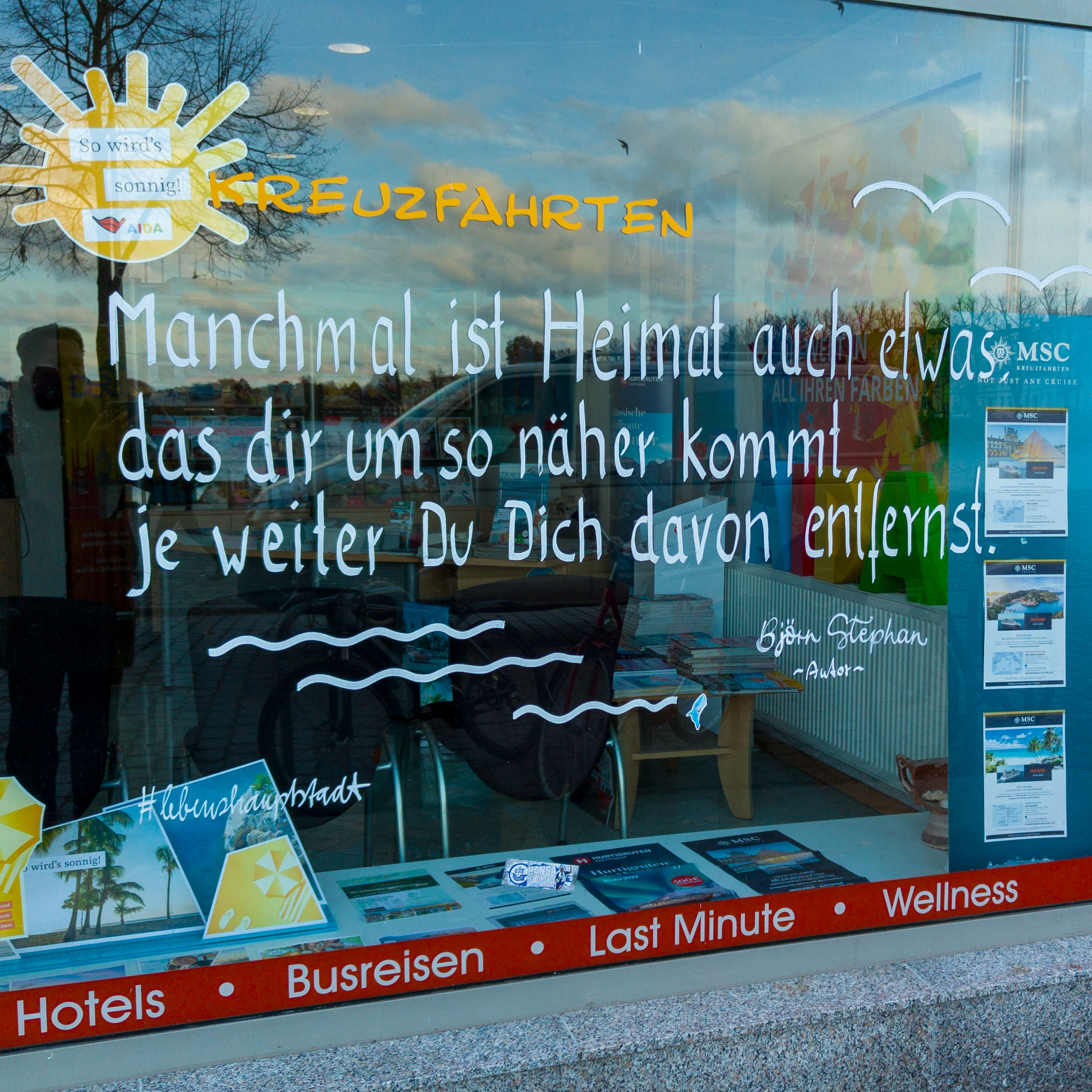 Apropos Kunst: An vielen Geschäften sind originelle Sprüche geschrieben.