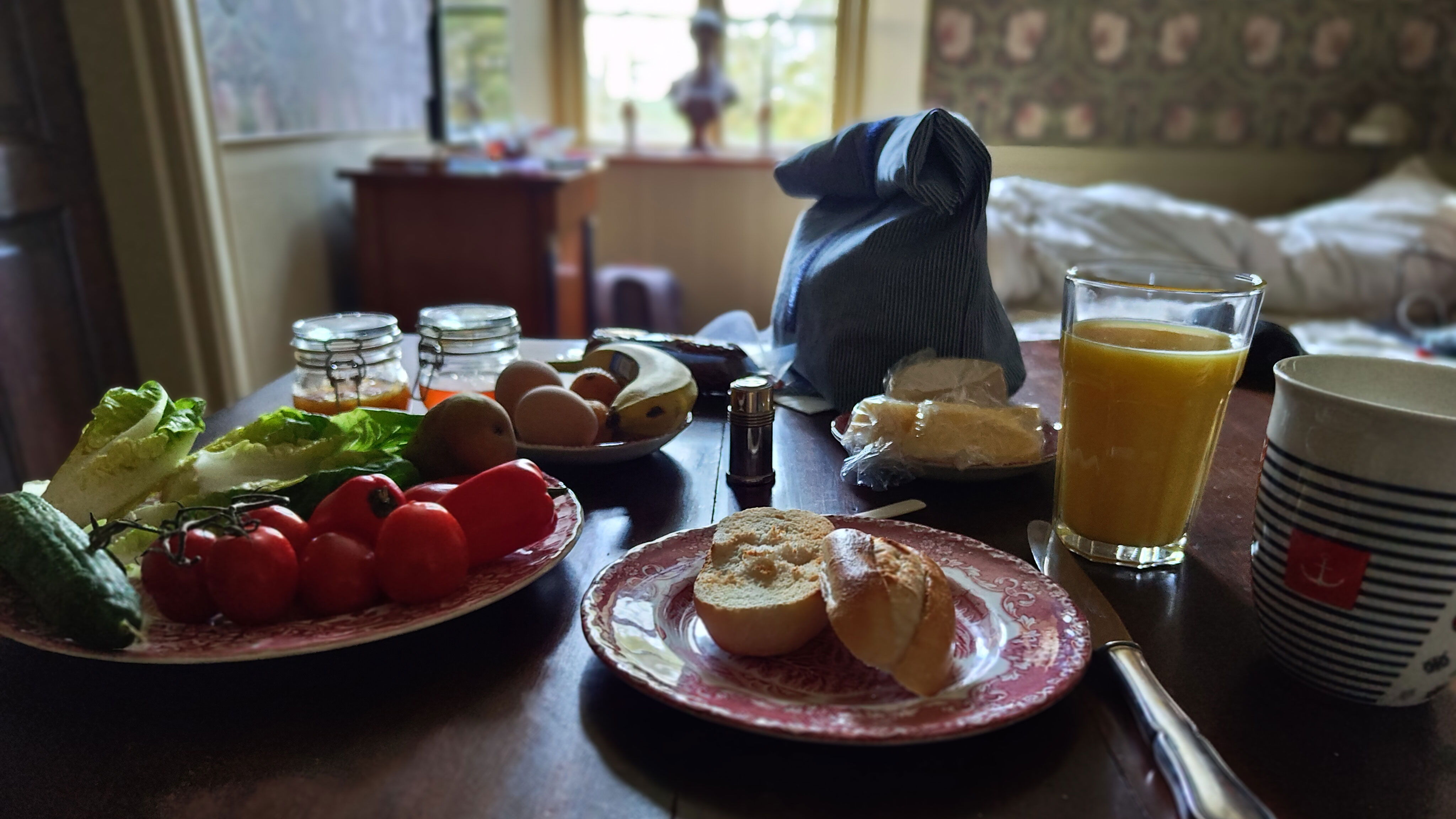 Am Morgen stand dieser wunderbare Frühstückskorb vor meiner Tür. Vor dem Sofa richtete ich das Frühstück an und genoss den Blick in den Park aus Maries Fenster in die herbstliche, leicht stürmische Szenerie.