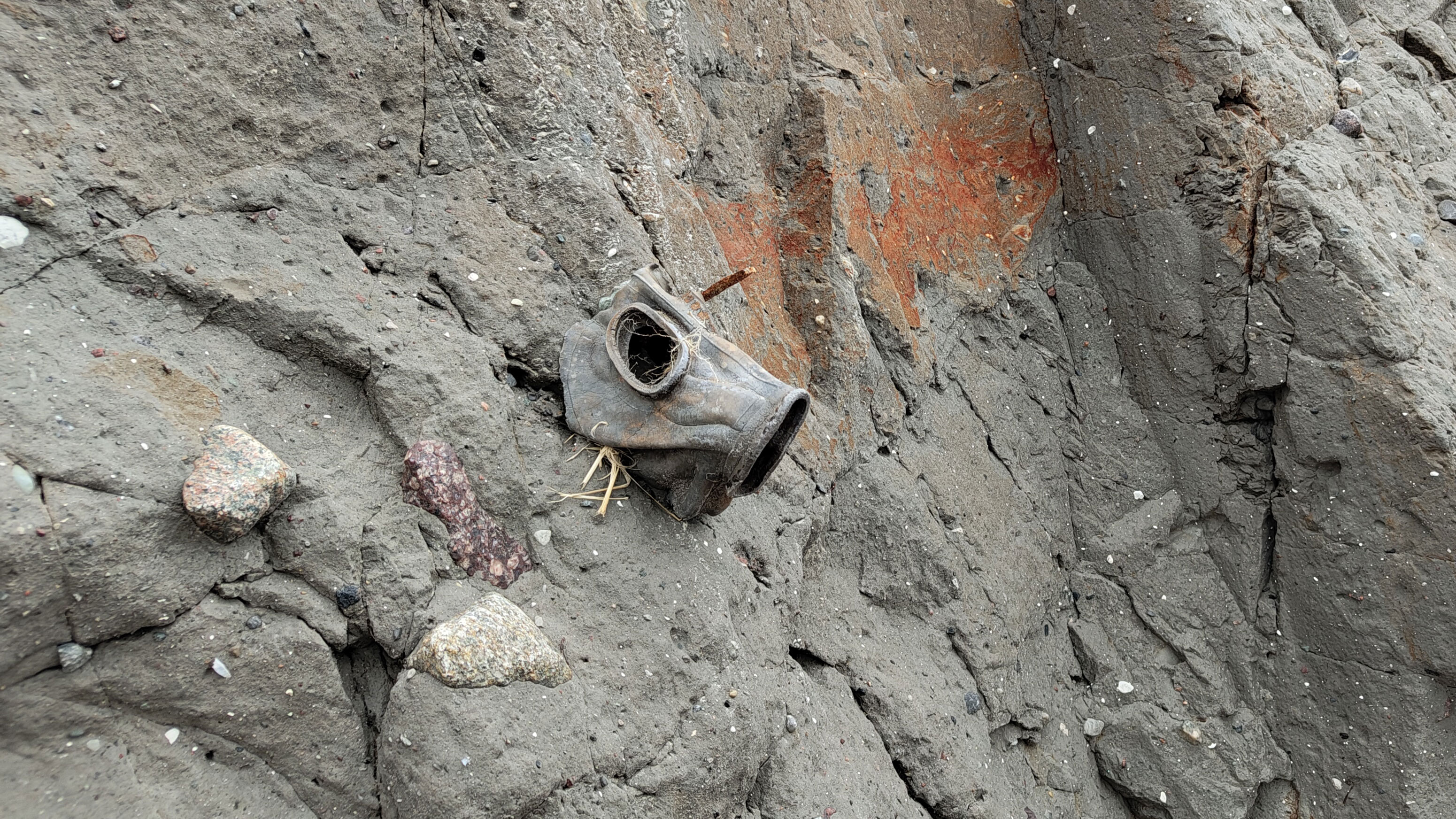 Von der Wehrmacht oder der Roten Armee lagen so Betonkuben auf dem Strand, die wohl abgerutscht waren, sowie ganz viel rostige Metall-Ketten, -Stangen und -Haken, alle sahen sehr militärisch aus. Als ich dann auf einmal etwas entdeckte, das mich sofort in den WW2 versetzte. Auf einem Stück Ast oder einer Art Stange hing der Rest einer Gasmaske, das war sehr unwirklich. Irgendwie wartete ich darauf, dass gleich eine Granate neben mir einschlug. Passiert nicht.