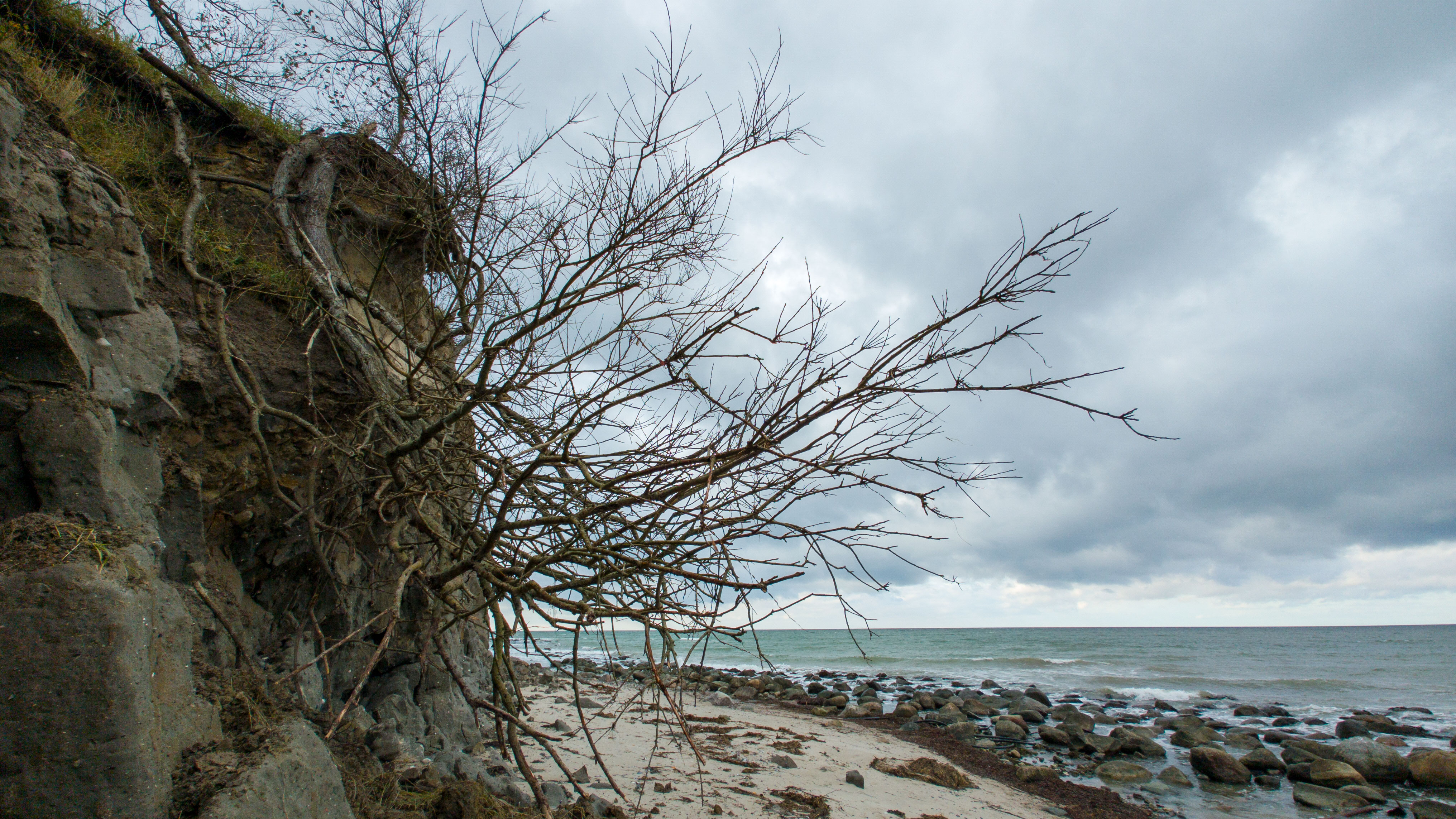 Nun lief ich bis zur Wasserkante und dann den Strand entlang. Später erhob sich links die Steilküste der Halbinsel Wurstow und rechts die Wellen. Zwischen all den Steinen fielen immer diese grauen Brocken auf, zuerst dachte ich, dass das eine Art Lem sei, denn es sah auch so aus, als sei es eine Schicht unter dem sandigen Teil der Insel. Ich faste es an und merkte, dass es Beton ist, mit dem die Düne geschützt werden sollte.