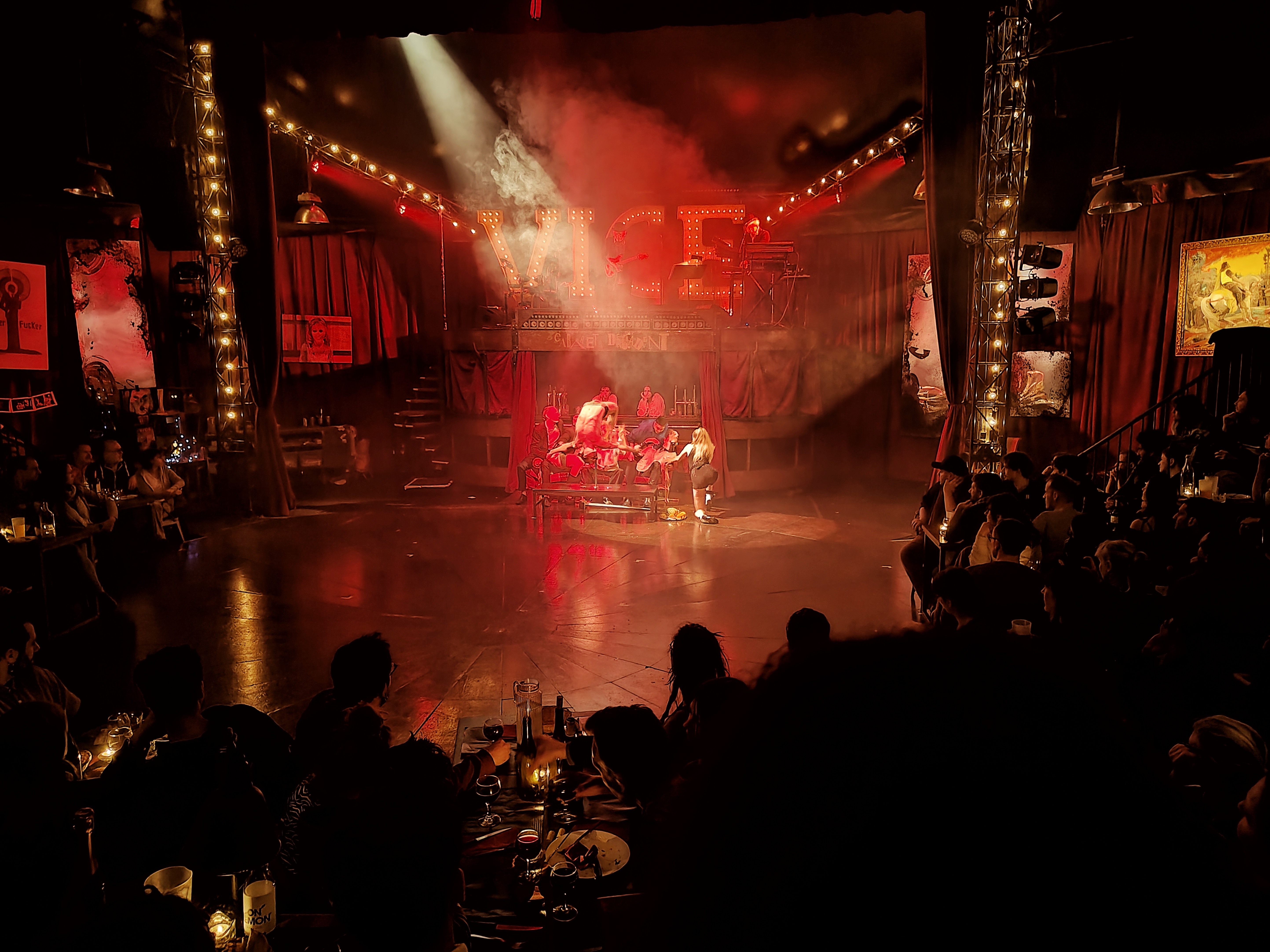Für den Abend hatte J. Karten für den “Cirque Electrique” besorgt. Was mich dort erwartet, konnte ich von der Webseite nur grob erahnen. Meine Grundstimmung war “Ich bin sehr gespannt!” Wir landeten mit der Metro irgendwo im Nirgendwo am gefühlten Rande von Paris. Liefen noch ein Stück, dann kam ein Busbahnhof und dahinter erhob sich majestätisch ein Zirkuszelt, das wir über einen Waschbeton-Freitreppe erreichten. Die Raucher standen meist gedrängt unter irgendwelchen Zeltdächern und fröstelten ein wenig, denn es war merklich kühler geworden. Beim Betreten des Zeltes waren die ersten Schritte in den hell erleuchteten Ring vor den Rängen der Zuschauer. Die Ränge lagen im Dunkel hinter den Spots der Manege. Nur die Akustik von den Rängen ließ uns erahnen, es ist voll, sehr voll. Beim Blick über die Ränge war es kaum zu erahnen, wo noch zwei Plätze für uns frei geblieben sind. So schickte ich J. vor mal zu fragen was frei ist und ich ging in der Zwischenzeit Getränke holen denn die Traube vor der Bar war nicht minder kleiner. Das mit den Getränken ging dann doch erstaunlich schnell und ich stand wie bestellt und nicht abgeholt in der Manege und guckte wo J. rum turnte. Einige Plätze hatten Tische, denn es war auch möglich, ein Dinner vorher zu bestellen. Bei einem Tisch gab es die Chance das ein Platz vor dem Tisch mit Tischplatte im Genick frei war und ein Platz oben auf der Bank, etwas weiter links saß ein Paar, die wohl ihr erstes Date hatten, auf jeden fall hatten sie sich sehr ausgebreitet und waren sehr innig ins gespräch vertieft. Bei dem jungen Mann mit den dunklen, wild lockigen Haaren mit ein paar weißen Strähnen kann ich schon verstehen, dass die Dame dann immer quer auf der Bank saß, um in die dunklen Augen zu schauen. Mittlerweile hatte ich mit den Getränken auch die Höhen erklommen und meinte nur zu J., ob er die Dame nicht bitten könnte, mit ihrer Begleitung etwas zusammen zu rutschen. Ich sah nur ihren ungläubigen Blick als die Frage kam und ein wenig bewegte sie sich und wir beide hatten auf einmal doch noch nebeneinander Platz. Das Herrliche waren dann unsere direkten Nachbarn. Auf der rechten Seite saß ein Paar etwa gleich alt mit mir, etwas steif auf den ersten Blick und mega entspannt, als wir nach den Plätzen fragten. Das ältere Paar auf der linken Seite war sichtlich etwas pikiert. Ob das Essen lag oder die Nähe und Enge zu allen anderen Gästen. Dazu bewegten sie sich kaum. Ich musste mehrfach hingucken, um zu sehen, ob das nicht Puppen sind, die dort neben mir sind. Als sie ihren Nachtisch serviert bekamen und diesen verspeisten, war es klar, keine Puppen. Das restliche Publikum war eine mega lockere Mischung aus Kreativen und nicht die, die so aussahen, als seien sie Kreative. Sowie auch eher alternative. Unser Platz stellte sich als absolut perfekt heraus direkt in der Mitte und die Show wirkte so, als sei sie für uns inszeniert worden. Das Conférencier setzte gleich zu Anfang schon mal das Niveau nach, ganz tief unten, so dass wirklich jeder wusste, woran er ist mit der kommenden Show. Details will ich nicht verraten, außer dass es wirklich sehr viel außergewöhnliche Akrobatik gibt mit viel Nacktheit plus einem gehörigen Spritzer von Steampunk, Punk und Fetisch.