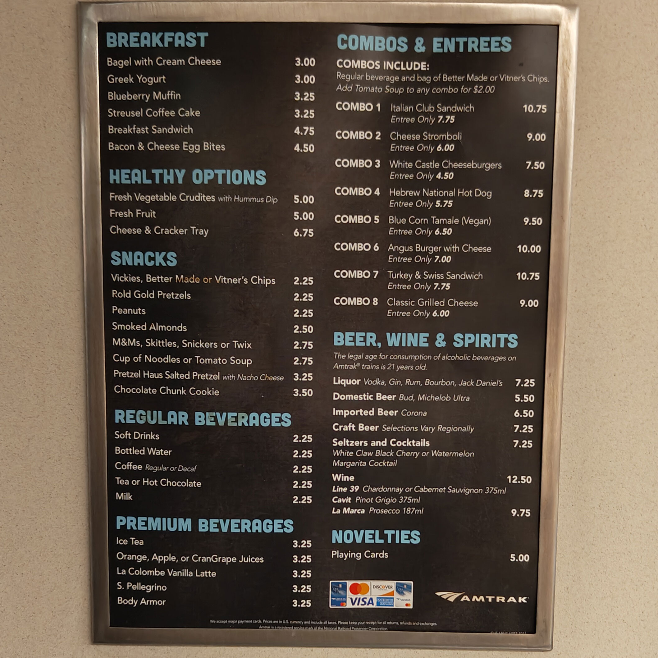 Uber setzte mich am Baustelleneingang der Union Station ab. Der Weg hinein war ein Bergauf und Ab über die Rolltreppen, erst mal in die Halle, dann ein Sandwich suchen (erfolglos), zurück in die Halle. Auf halber Strecke die Ansage “Der Zug ist aufgerufen!”. Fast wieder den Weg zurück. In die Absperrbänder einsortieren und warten. Zuerst wurde die Holzklasse hineingelassen, dann wir, die Business Class ist wohl gesondert von der Lounge dorthin gebracht worden. Guter Fensterplatz, der Zug fuhr tatsächlich eine Minute früher los.