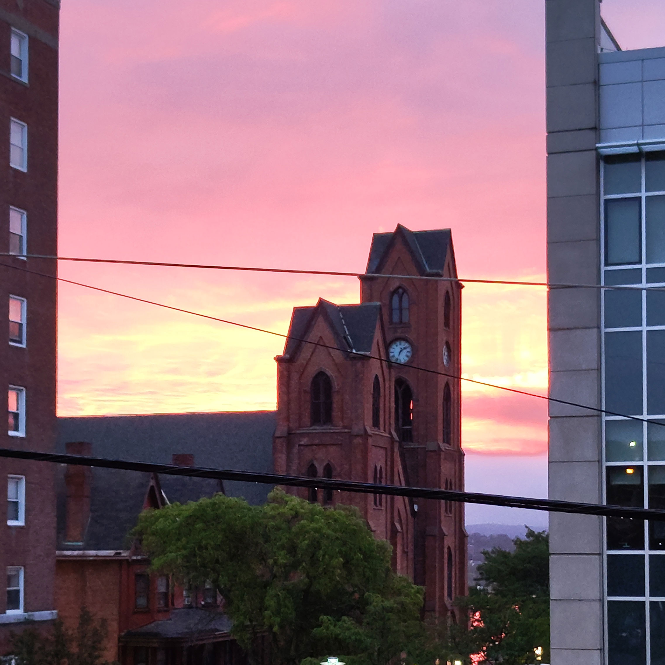 Noch im Dunkeln feilte ich an Texten, als es zwischen den Häusern leicht hell wurde und der Himmel sich in ein intensives Pink wandelte.